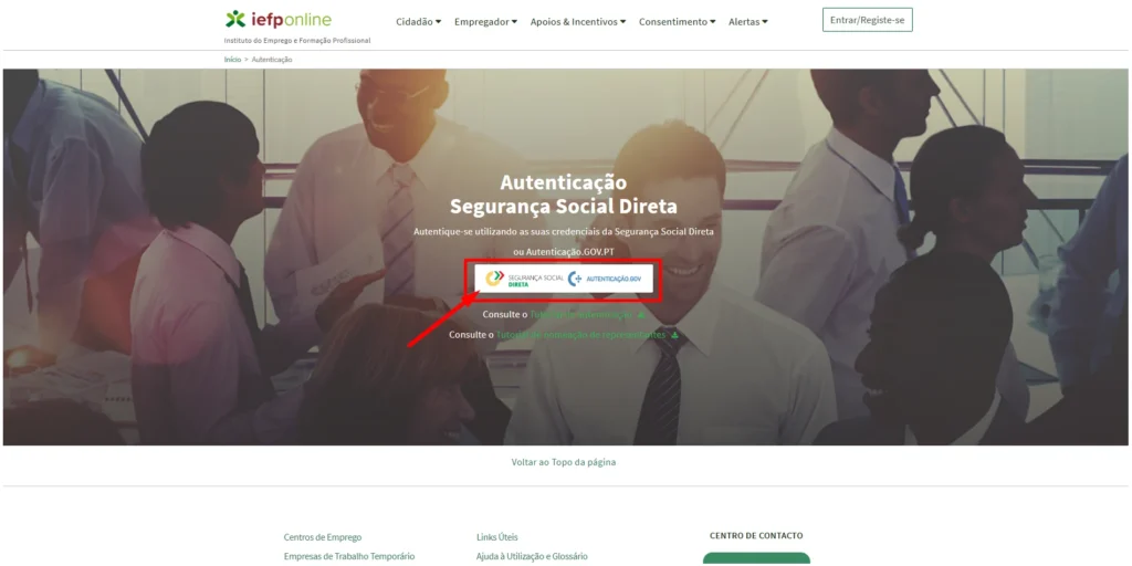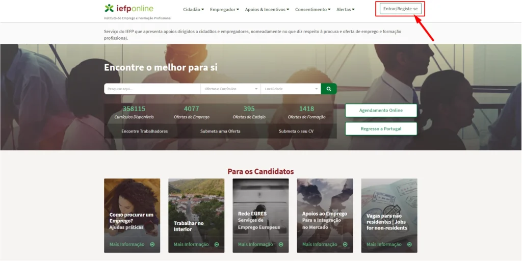 2- No canto superior direito clique em Entrar/Registe-se para entrar no Portal IEFP.