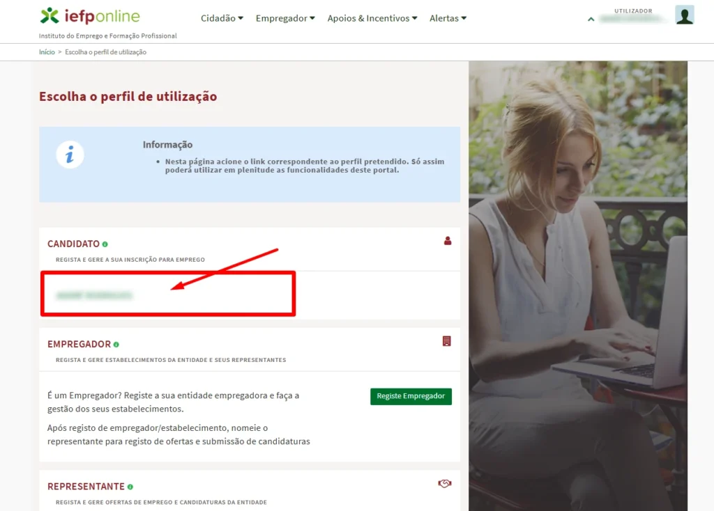 4- Após login feito, clique no seu nome, debaixo do separador “Candidato” conforme imagem abaixo: