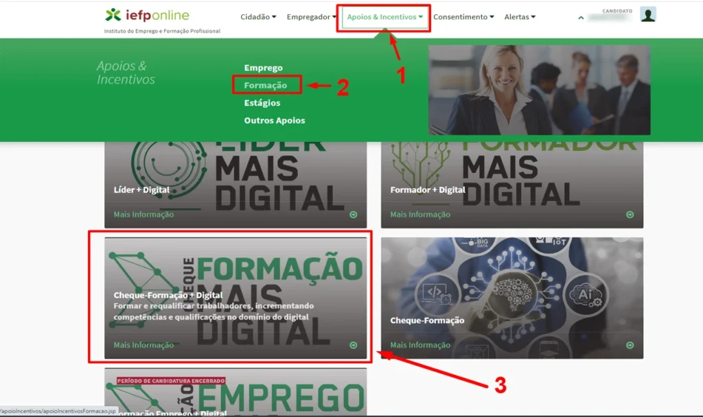 5- No menu superior, passe o rato pelo item “Apoios & Incentivos”, em seguida clique em “Formação” e na página que abrir selecione “Cheque-Formação + Digital”, conforme ordem na imagem abaixo.