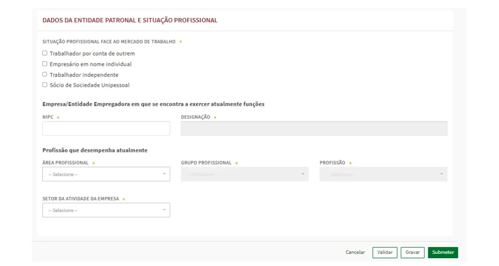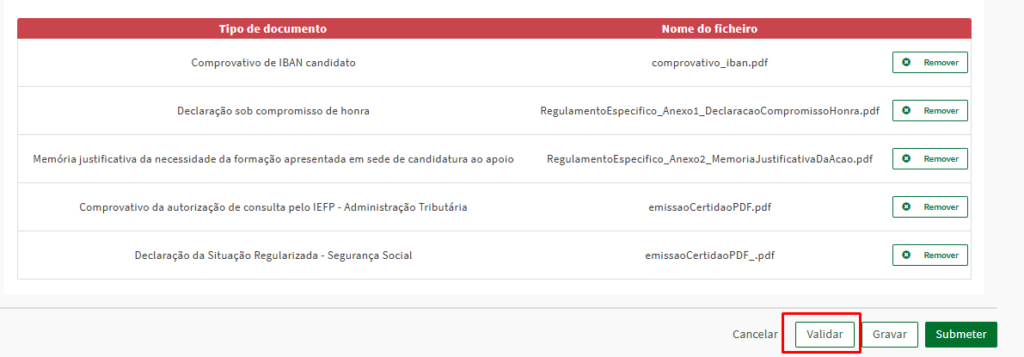 Após preencher toda a informação, deve clicar em “Gravar” para que a informação inserida fique gravada. É também recomendado clicar em “Validar” para verificar a existência de erros. Caso exista algum erro, o sistema automaticamente irá identificar e alertar.