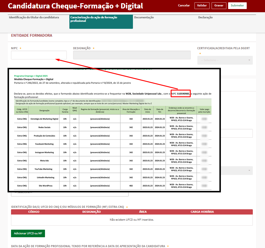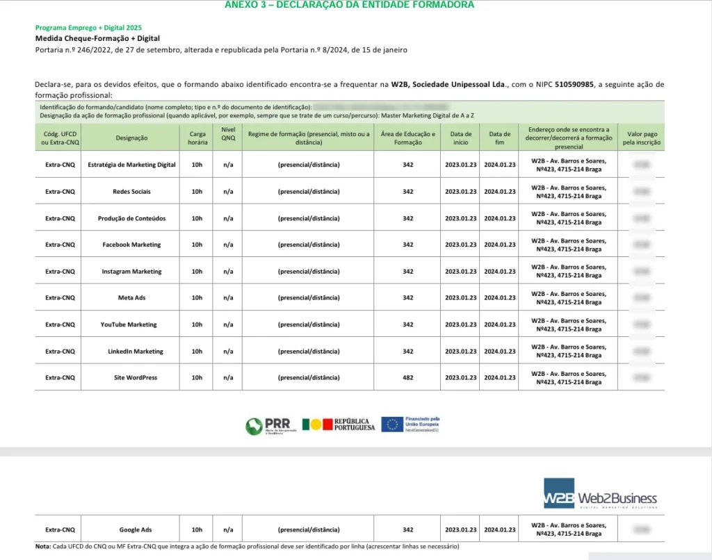 Antes de iniciar a candidatura deve enviar um e-mail à equipa de Vasco Marques a solicitar o Anexo 3 – Declaração da Entidade Formadora. Trata-se dum documento para efeitos de candidatura ao Cheque-Formação + Digital, que comprova a sua frequência na ação de formação profissional com a empresa W2B, Sociedade Unipessoal Lda.