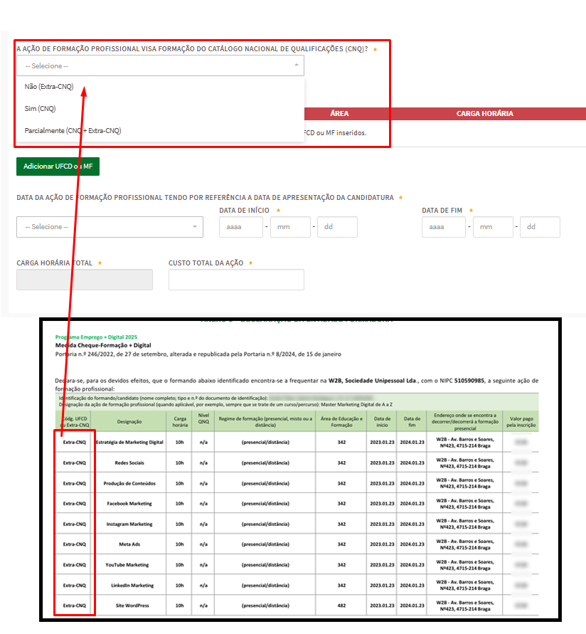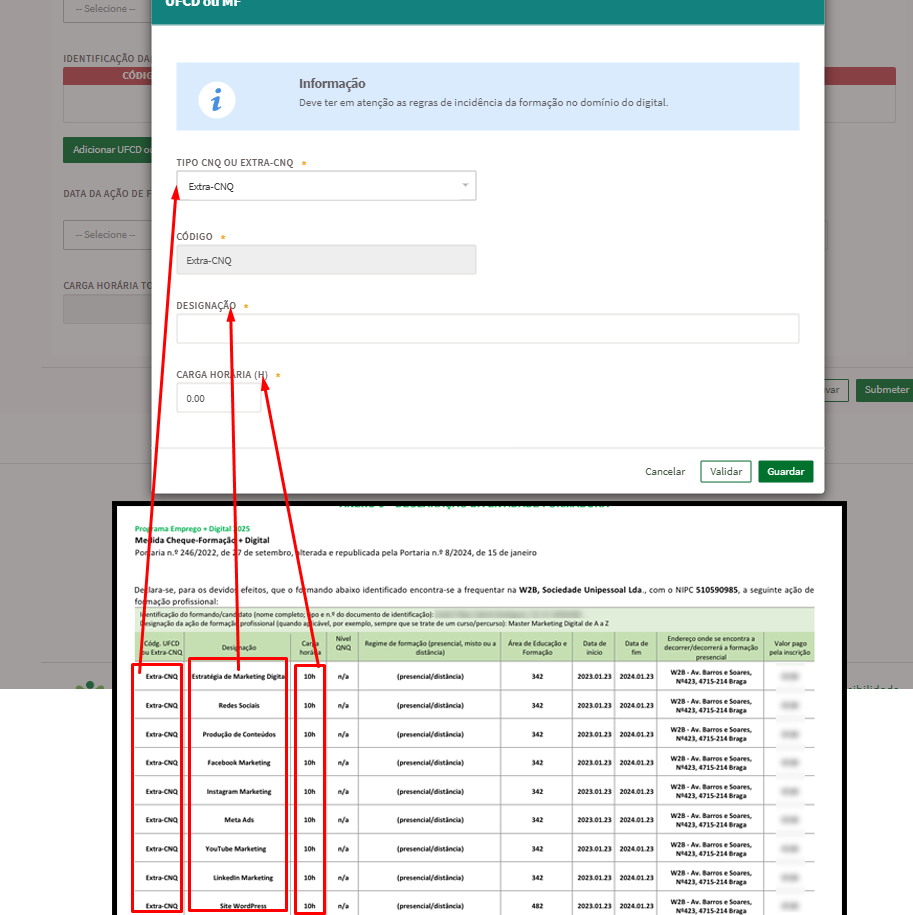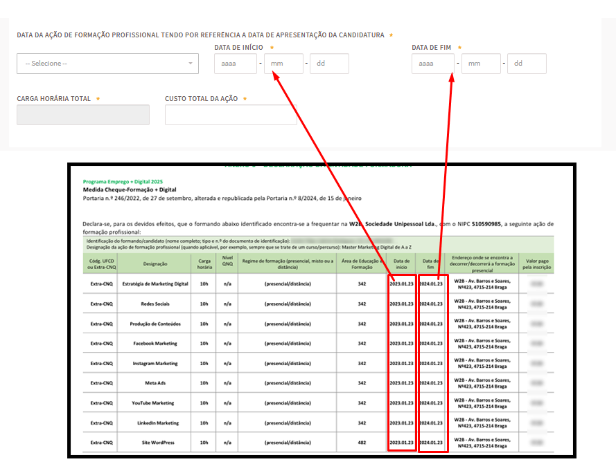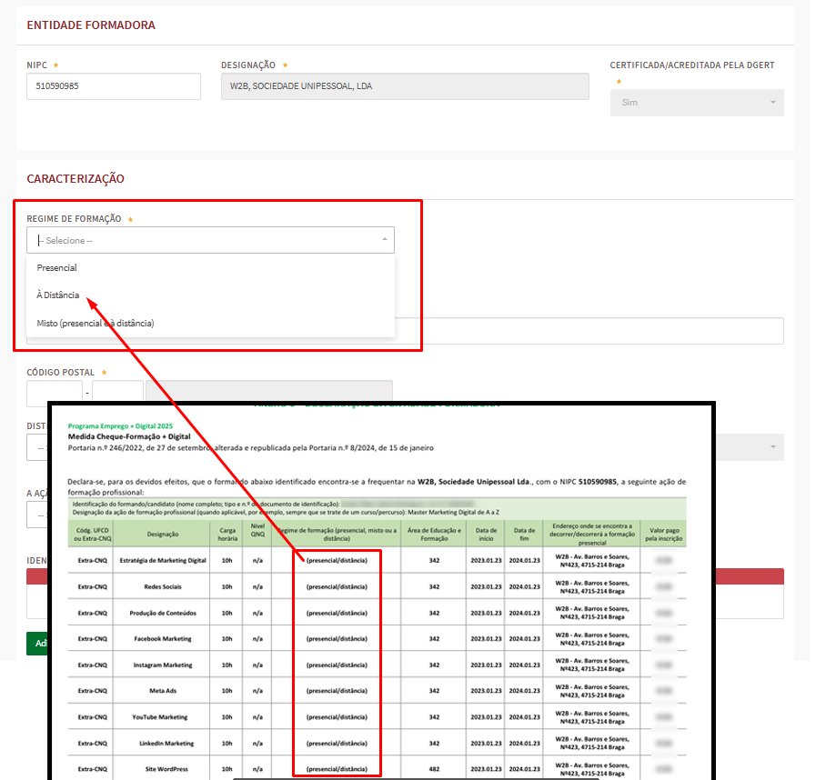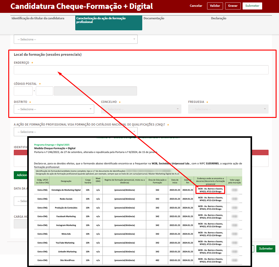 12- No campo “Local da formação”, deve colocar a morada da empresa W2B de acordo com o indicado no documento.