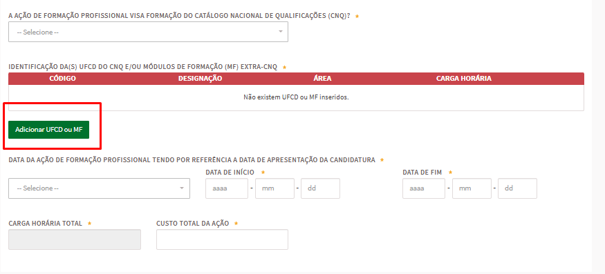 14- Na tabela abaixo, de “Identificação das UFCD do CNQ e/ou Módulos de formação (MF) EXTRA-CNQ”, deve clicar no botão verde “Adicionar UFCD ou MF”