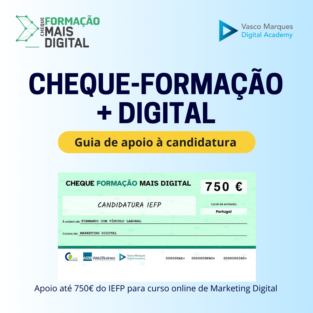 Através do Cheque-Formação + Digital pode inscrever-se num curso de Marketing Digital Certificado, aumentar os seus conhecimentos e competências, e ainda ser reembolsado do valor do curso, até 750€.