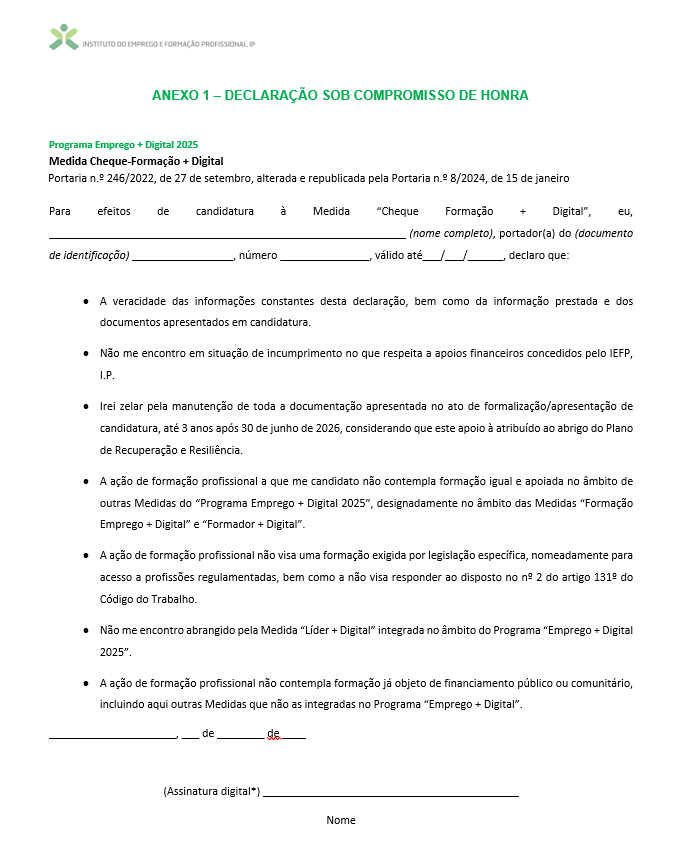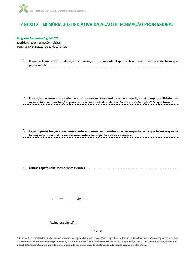 Preencha o documento com os seus dados e no final deve colocar a sua assinatura digital. No caso de não ter acesso à assinatura digital através do Chave Móvel Digital ou do Cartão de Cidadão, ou de não conseguir ter a mesma disponível no momento ou em tempo oportuno, poderá assinar conforme Cartão de Cidadão, sendo que para tal, e com vista a garantir a proteção de dados, o candidato/titular da candidatura deve enviar cópia do seu documento de identificação autorizando para os devidos efeitos.