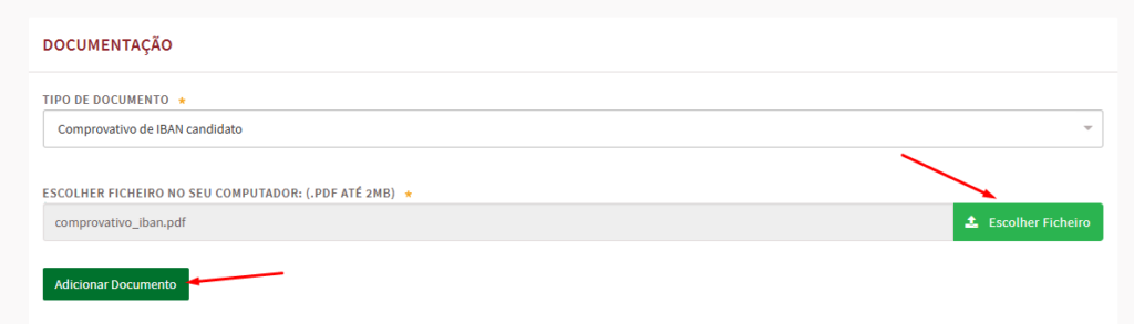 23- Deve escolher o documento que vai fazer upload, clicar em escolher ficheiro, fazer upload do documento, e clicar em “Adicionar documento”. Repita o processo para os 6 documentos obrigatórios.