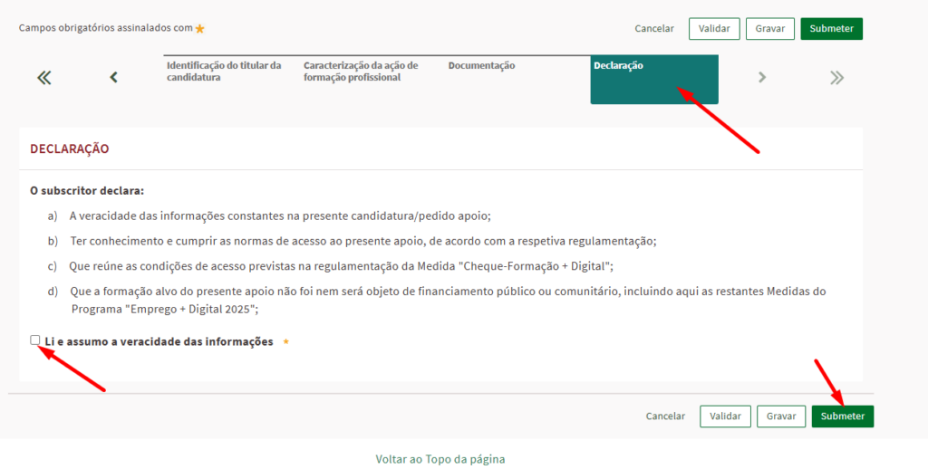 Neste último separador deve marcar a caixa de “Li e assumo a veracidade das informações” e finalmente submeter a sua candidatura.