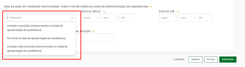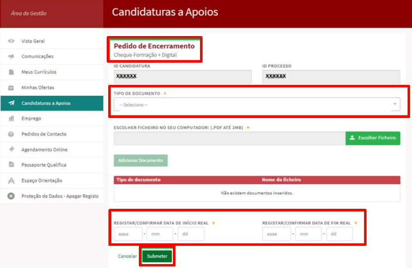 No Pedido de Encerramento, deve fazer upload de todos estes documentos, colocar a data de inicio e de fim da formação, e finalmente submeter