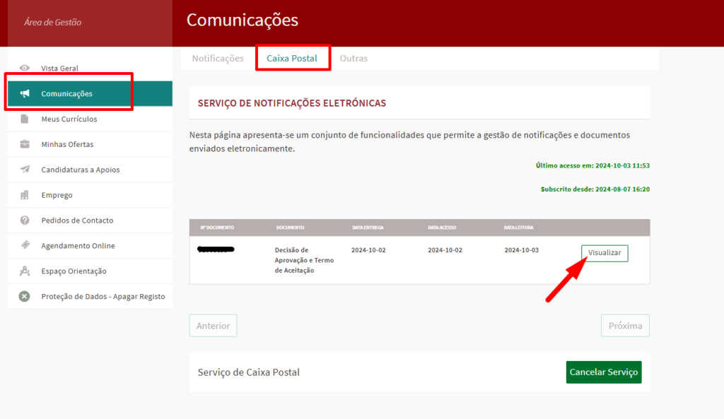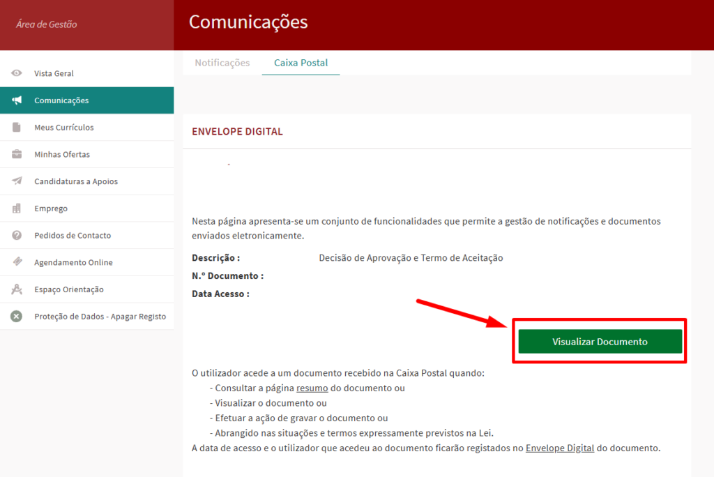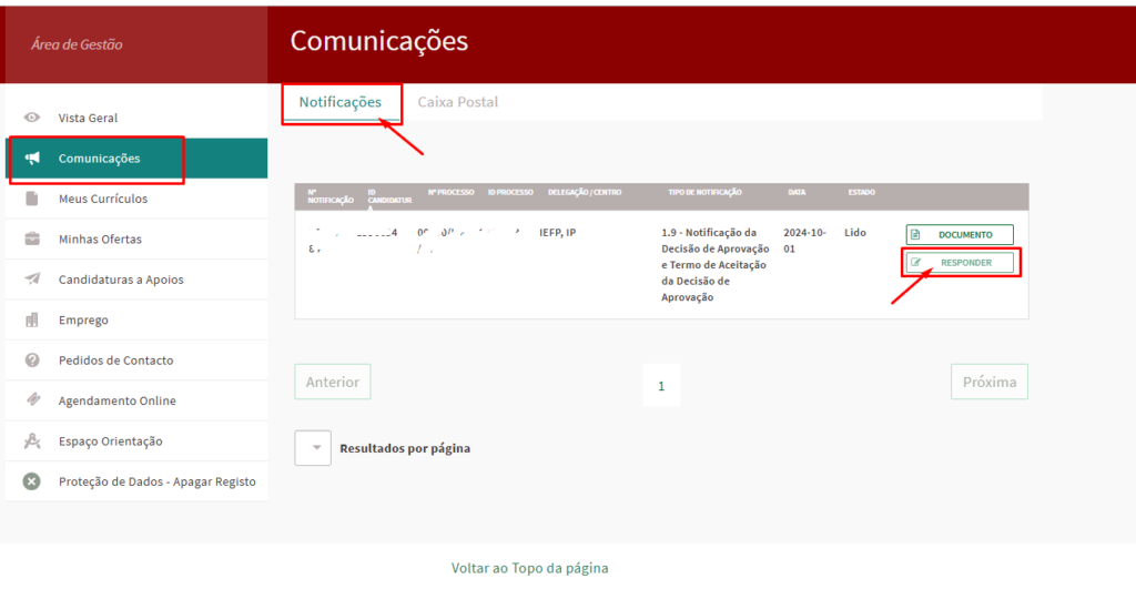 Para visualizar a notificação, deverá voltar a entrar no portal IEFP, e dentro do seu perfil ir a Comunicações > Caixa Postal