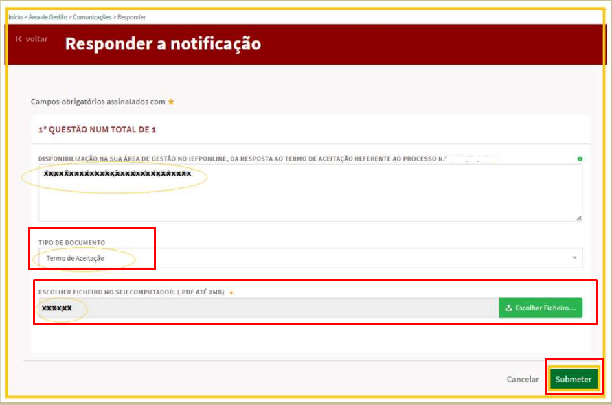 Ao clicar em “Responder” irá abrir uma janela onde deve escrever no 1º quadro “Submeto o termo de aceitação devidamente assinado conforme solicitado” e ainda fazer upload do documento anterior assinado, e submeter o envio do documento. (Tem 10 dias úteis para realizar este passo, a contar a partir do momento em que recebeu o documento)