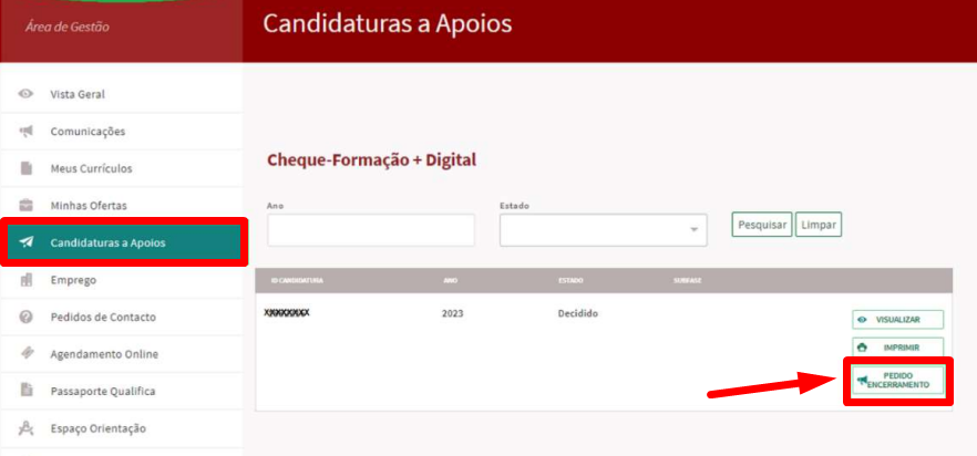 Após alguns dias, no menu “Candidaturas a Apoios”, deverá ter o botão “Pedido de Encerramento” ativo.