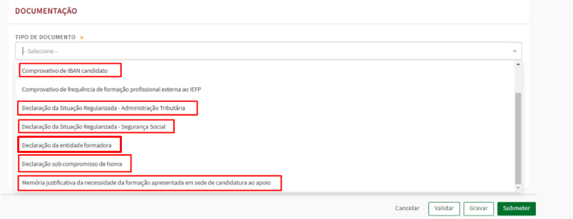 22- Clique no tipo de documento, e selecione o documento que pretende fazer upload (os obrigatórios são os assinalados a vermelho na imagem abaixo)