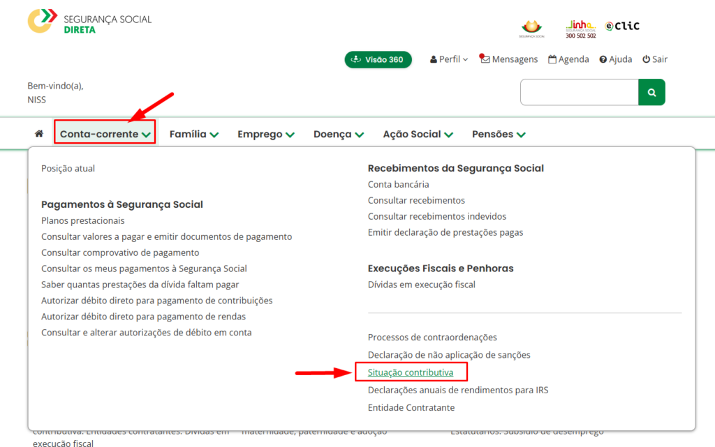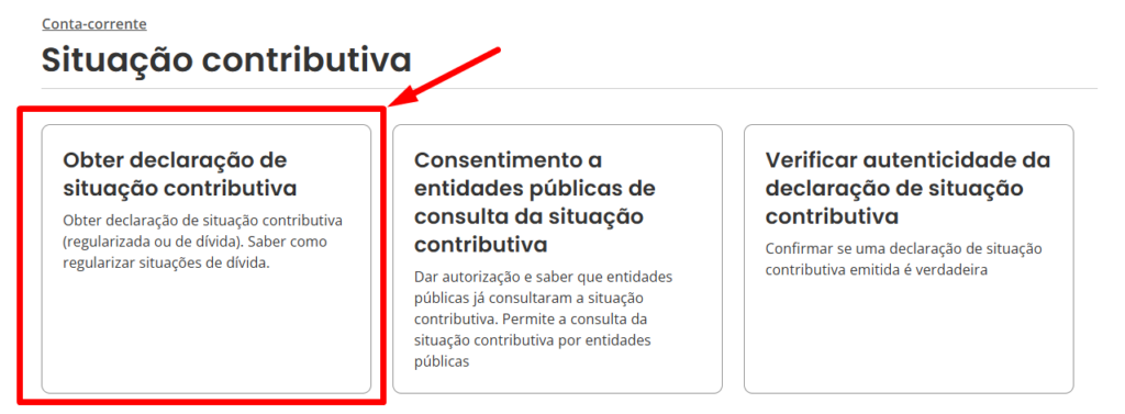 Ao fazer login, clique em “Conta-Corrente” e em seguida “Situação contributiva”, ou alternativamente clique aqui para ser enviado diretamente para a página.