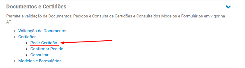 Puxe a página para baixo e encontre a área de “Documentos e Certidões” (está por ordem alfabética). Clique em “Pedir Certidão”, ou entre diretamente neste link aqui.
