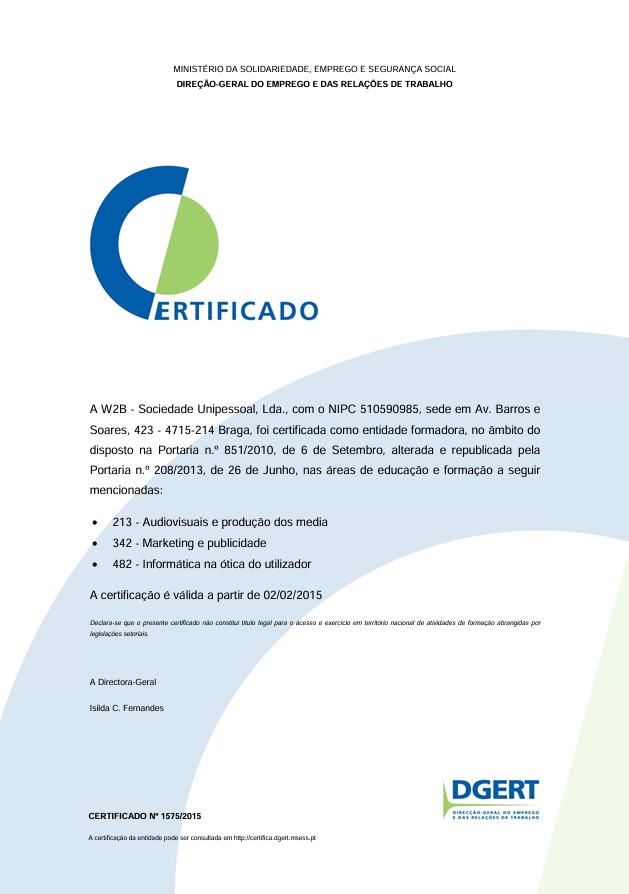 Somos uma entidade certificada DGERT (Direção-Geral do Emprego e das Relações de Trabalho), desde 2 de fevereiro de 2015, garantido qualidade e reconhecimento oficial nas suas formações.